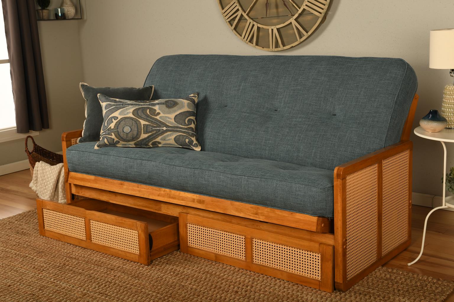 Westport Full-size Frame in Honey Finish includes #6000 Linen Aqua Mattress and Storage Drawers